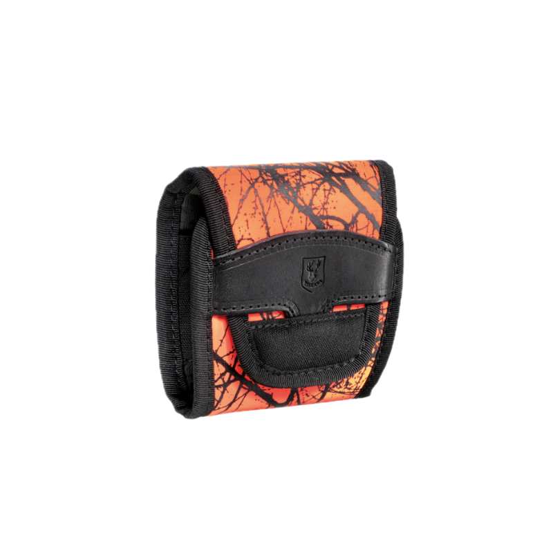 Pochette à balles en nylon orange effet branches, fermée sur les côtés, 7 tubes multicalibre, inserts élastiques pour tenir les balles, passant pour ceinture et fermeture silencieuse en cuir nabuk sans métal. Logo Riserva sur le cuir