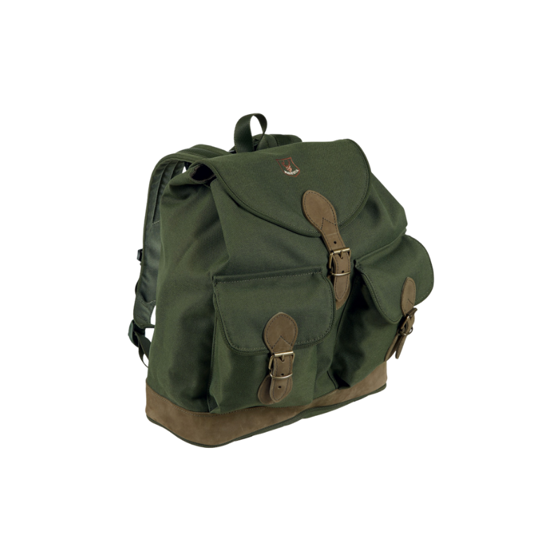 Petit sac à dos en cordura naturelle et parties en cuir, équipé de 2 poches extérieures et sangle.