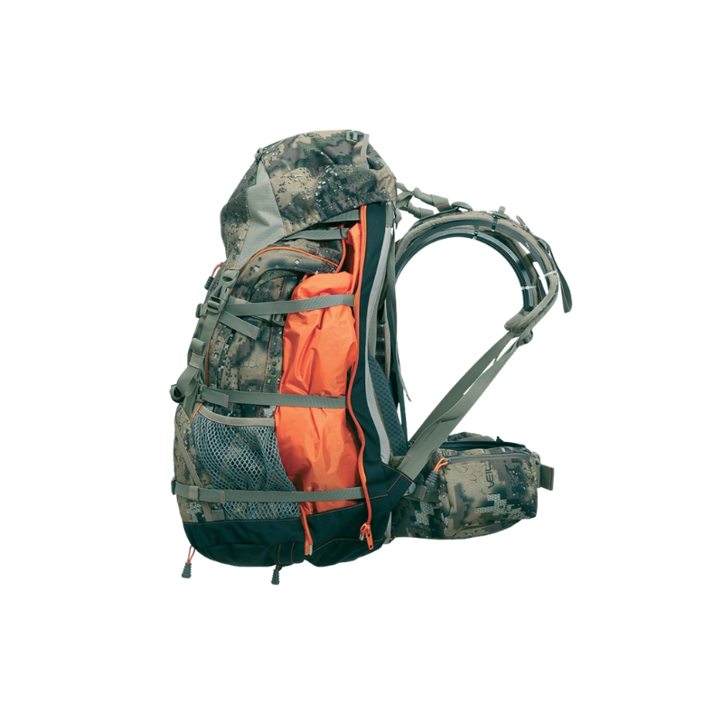 Il conjugue efficacité de portage avec des charges idéalement réparties, fonctionnalité avec ses attaches spéciales armes à feu ou arc, son ouverture variable pour aider aide au chargement, son accès direct dans la partie basse du sac pour éviter de le vider pour récupérer un objet situé au fond.